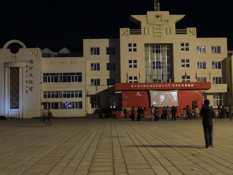 三三兩兩的市民站在大螢幕前欣賞蒙古的歷史戲劇,